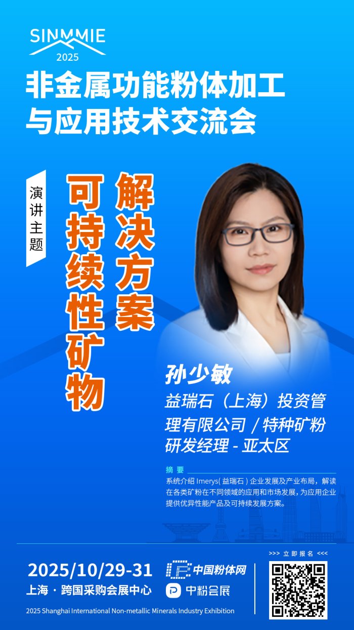 10月29-31日,北京粉体技术协会、柏德英思展览(上海)有限公司、山东中粉会展服务有限公司将在上海跨国采购会展中心联合主办“上海国际非金属矿工业展览会(SINMMIE2025)”,展会现场将同期举办“非金属功能粉体加工与应用技术交流会”,届时将邀请益瑞石(上海)投资管理有限公司亚太区特种矿粉研发经理孙少敏作《可持续性矿物解决方案》,系统介绍Imerys(益瑞石)企业发展及产业布局,解读在各类矿粉在不同领域的应用和市场发展,为应用企业提供优异性能产品及可持续发展方案。
